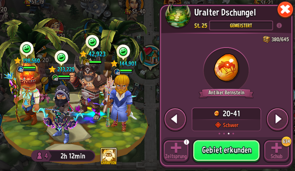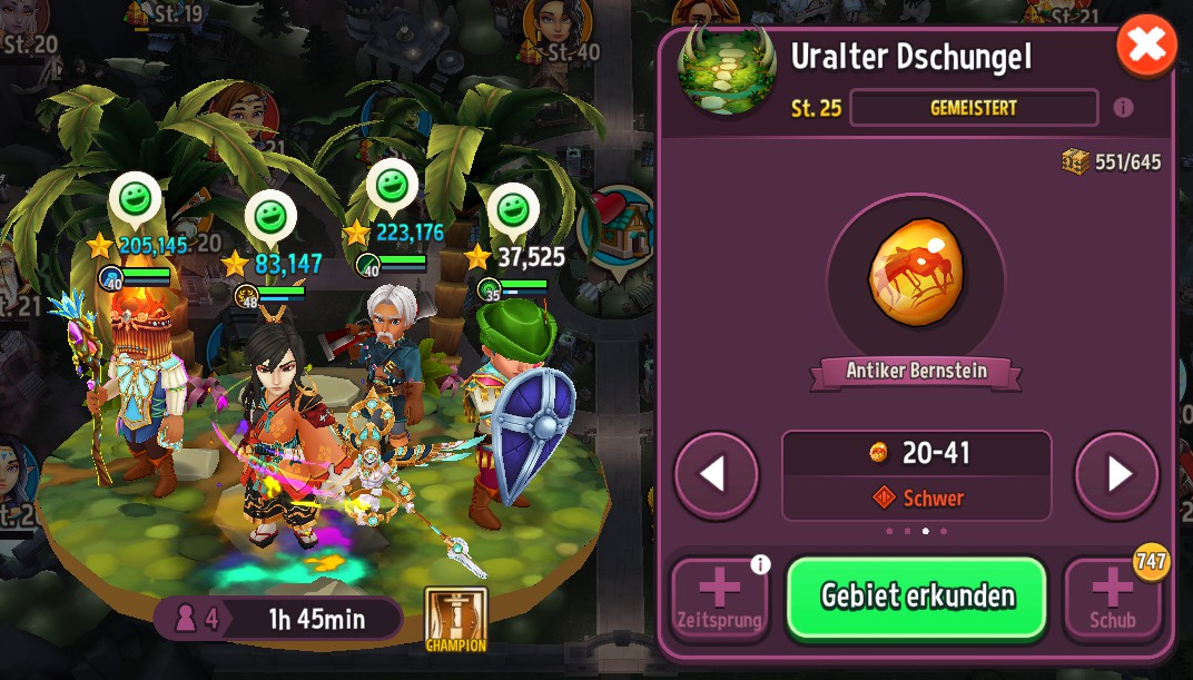 Die dargestellten Helden sind keine wirkliche Empfehlung. Es waren eben die, mit denen ich den Turm (unter Einsatz von Kraftverstärkern) bezwingen konnte. Man kann im Hinterkopf behalten, dass ein Schadens-Held so grob 150.000 Sterne aufweisen können sollte, damit man es versuchen kann - alternativ (siehe weiter unten) mal das Elysium auf extrem laufen - ist ein ähnliches Gefühl.