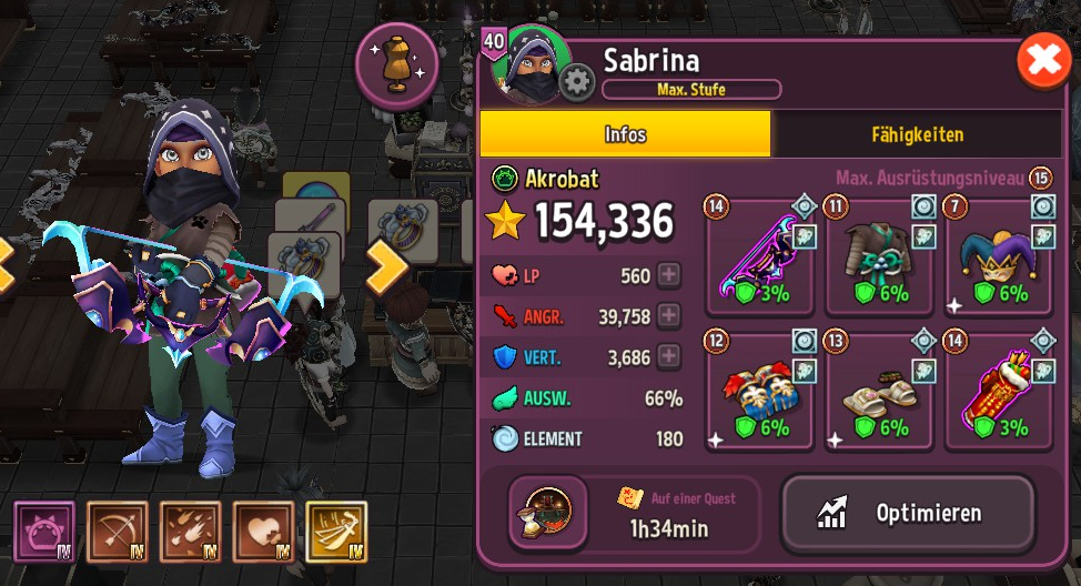Schurkenheld, ebenfalls auf krit. Treffer gepolt - bekam im Turm zu oft Treffer zugeschustert und hatte daher keinen wirklich guten Stand, hat aber dennoch ganz gut austeilen können. Die Ausrüstung war beim Ansturm auf den Turm noch leicht anders - der Held kam auch auf ~150k Sterne.